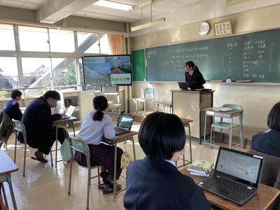 総探の時間では『菊池の魅力探究』を目的に、授業を行ってきました。菊池市長の講演会を導入として、菊池の魅力的な資源や情報、スポットを知り、各自が探究テーマを設定し、「もっと魅力的にするアイデア」や「課題解決につながるアイデア」を考えました。今回はクラス内で報告会を行い、情報共有する機会でした。あわせて、互いの報告について評価を行い、1/25に行われる「合同発表会」に参加する代表2班を選出しました。独特なアイデアや捉え方があり、菊池の魅力創造について探究することができました。少しずつ探究的な学びの意義や価値についても理解できてきたようです。
