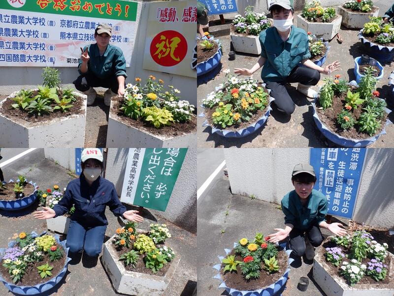 コンテストに出展すると菊池市の市役所や図書館などに写真を展示してもらえるということで、見に行く楽しみもできました。この寄せ植え作品はさらに、枯れた花がら取りやせん定等をしながら管理し、学校の受付である事務室前、学校の園芸科前の花壇に飾ってお客様のおもてなしと生徒の癒し花壇で活用します