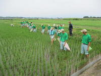 農業科1年生がヒエ(田の草)取り実習を行いました。生徒たちは全員裸足になり田んぼに入り1列に並んでヒエを取りました。始めは稲とヒエを区別するのに苦労していましたが、慣れてくると素早くヒエだけを取り除くことができるようになりました。