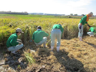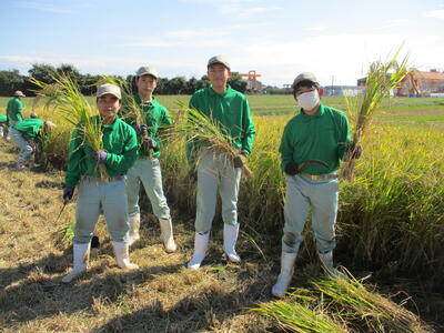 農業科1年生が6月に手植えで田植えを行った稲を、鎌を使って手刈りで稲刈りを行いました。