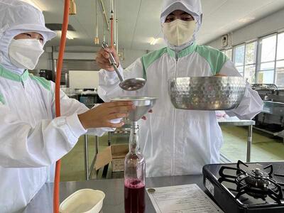 1年生の食品製造実習で持ち帰りのシソジュース製造をしました。