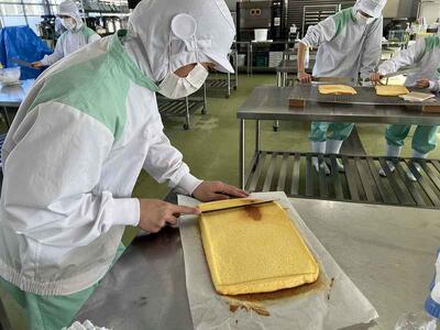 自分たちで作ったイチゴジャムを使用したロールケーキの製造を行いましたピース