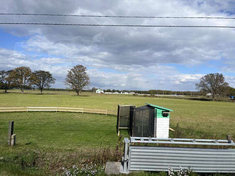 北海道に上陸しました。共進会会場に向かいます。窓から見える景色普段と違います。山が遠くに見えます。