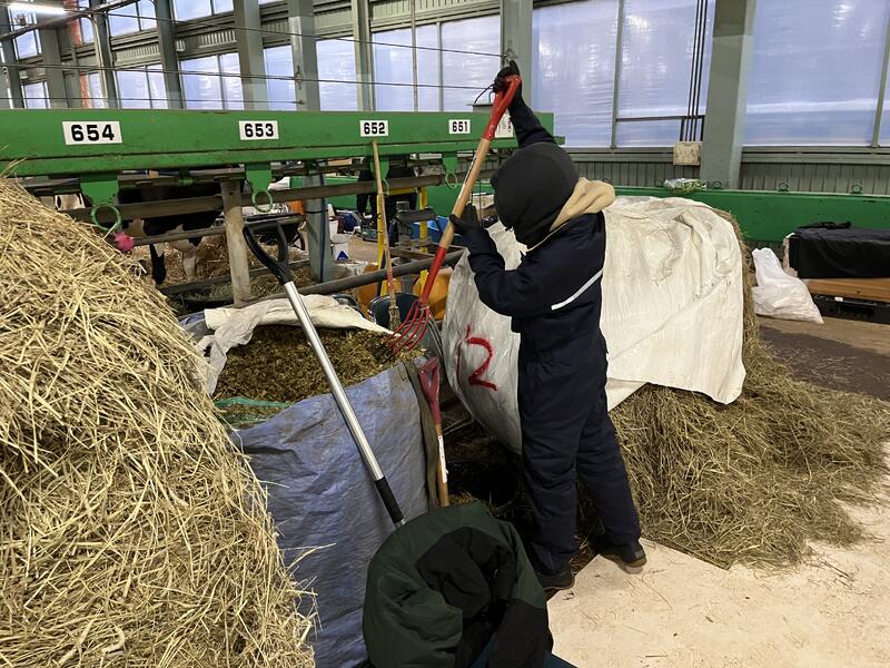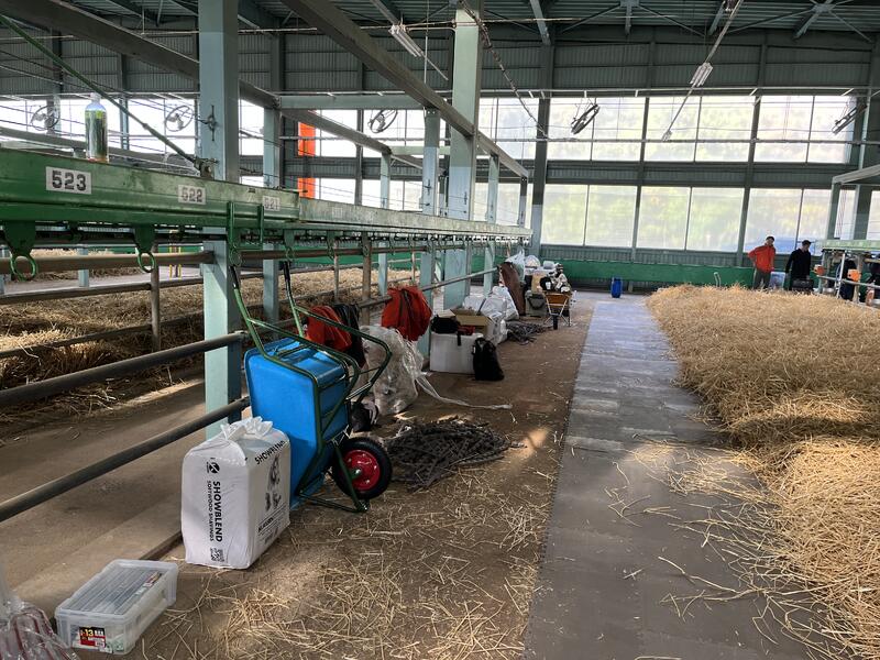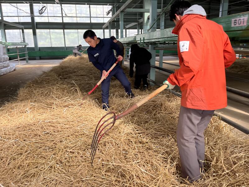 敷料の交換斑は今まで敷いていた、汚れた麦稈(ばっかん)の交換を行いました。2時間以上、頑張りました。北海道で汗かきました。
