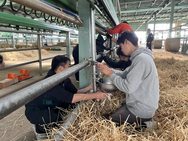 生徒は農家の方と実習に励みました。農家の方の作業、一つ一つの質とスピードがとても勉強になります。熊本県団の牛が良い状態で共進会に参加できるよう、みんなで協力して頑張ります。