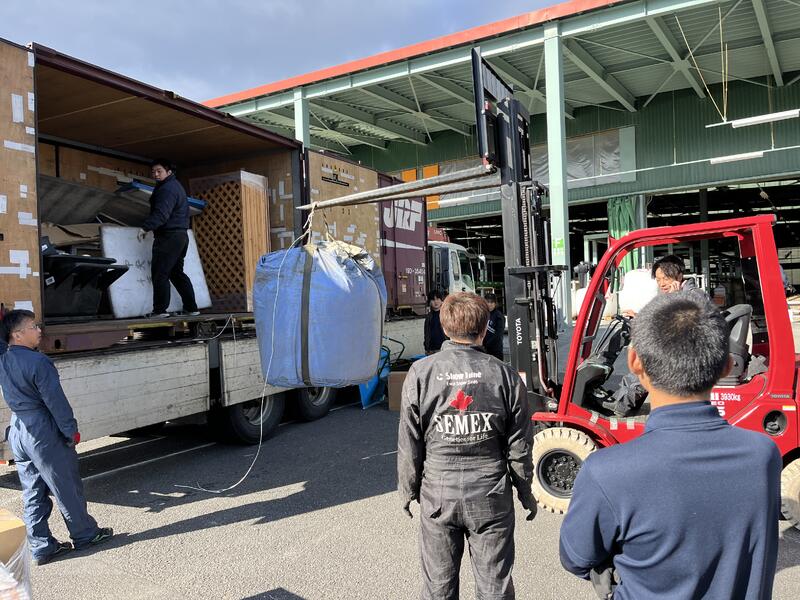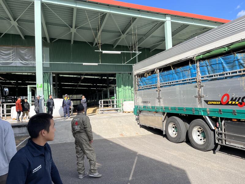 荷下ろしが終わりそううってとこで、いよいよ主役、13頭の牛が到着です。