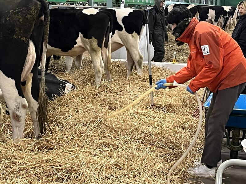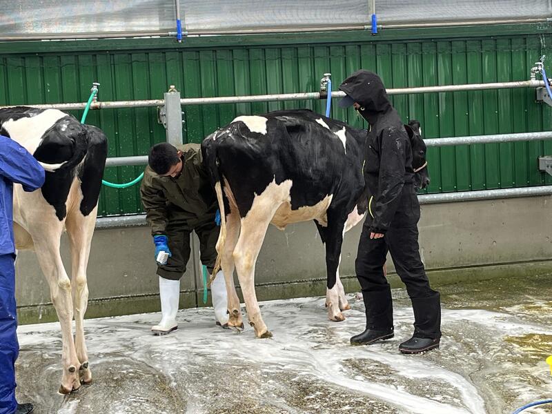 予定を立てるって簡単にいうけど、経験がなければ難しいこと。全日本ホルスタイン共進会参加経験の多い農家さんの判断で、今日は午後から毛刈りを計画。そのため、午前中の実習は大忙し。「牛洗い」「装飾」「敷料の交換」の3班に分かれての実習となりました。