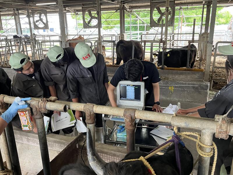 本校の肥育牛、先日は城北家畜保健衛生所の方に来てもらい、血液検査をしてもらいました。今回は、エコー(超音波画像診断装置)を用いて、肉質を診断(推測)してもらいました。
