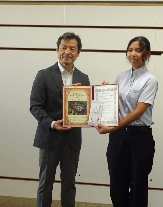 式の後の懇親会では、受賞者の方々や市長様とのお話がありました。それぞれの花壇の工夫や苦労、菊農の花苗を使ってくださり、賞を受賞されている方からのありがたいお話もあり、素敵なお庭の写真も見ることができました。生徒達の励みになりました。