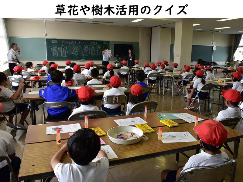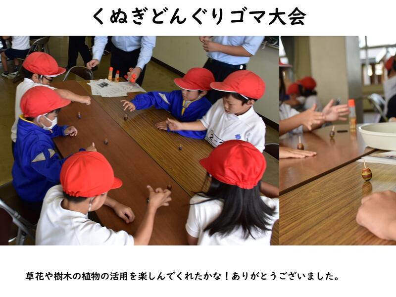 元気な小学2年生たちは意欲的にクイズに答え、静かに説明も聞いてくれました。花選びから工夫しながら絵を描いて集中していました。盛り上がったのはどんぐりゴマ大会、班予選から勝ち抜いた8人で決勝戦の様子はみんなが前に出てきて注目の一戦に見事優勝した児童には園芸科のお花をプレゼント