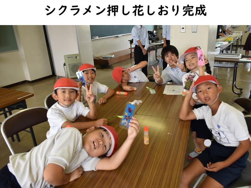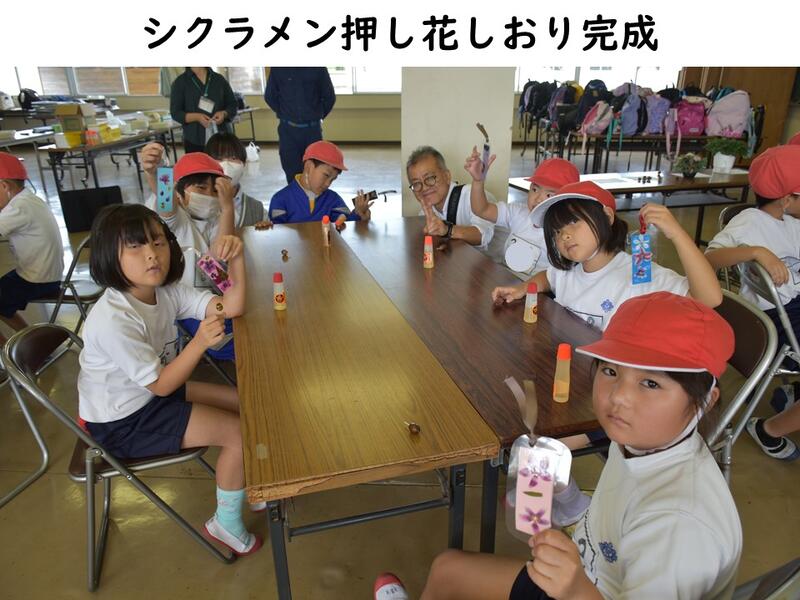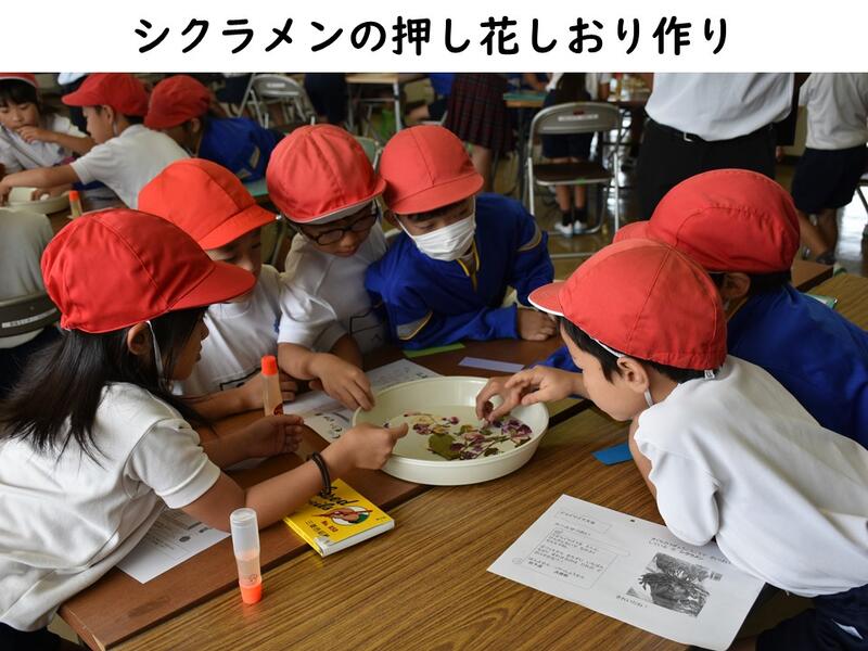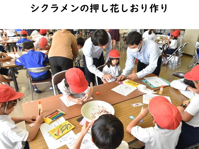 菊池農業高校園芸科3年生草花活用班が企画運営担当となり、泗水小学校2年生との交流授業を園芸科3年生専攻で実施しました。草花の活用ということで、株が大きくなる前の8月9月に咲くシクラメンは花や種子に栄養が行かないように、抜いて捨てていますが、そのシクラメンを使って押し花をつくり、しおりを作ろうという廃棄するものを活用するSDGs活動企画です。