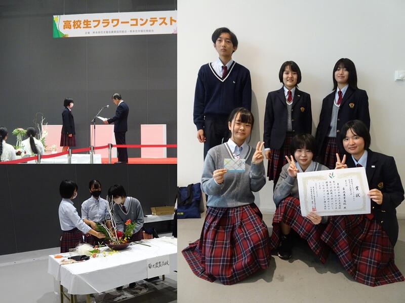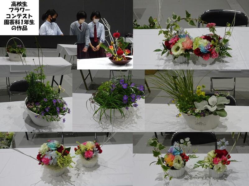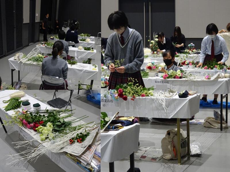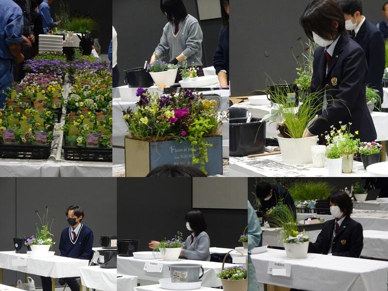 熊本城ホールでの高校生フラワーコンテストに園芸科1年生が出場しました。まだ、寄せ植えやフラワーアレンジ、生け花も授業ではまだ経験していないのですが、学校にあるもので基礎学習をしてから出場しました。花生け学校対抗戦は他校は華道部が出場する中、3位をいただきました。