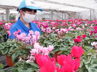 園芸科では販売のピークが過ぎても生徒たちはシクラメンの管理を行っています。購入後のシクラメンはいかがでしょうか。花数も増えて少し広がってきたときは、葉組みをおすすめします。咲き終わった花や枯れ葉は抜き、花を中心に、葉を外側に1枚1枚動かしていくと、バランスがよく整います。