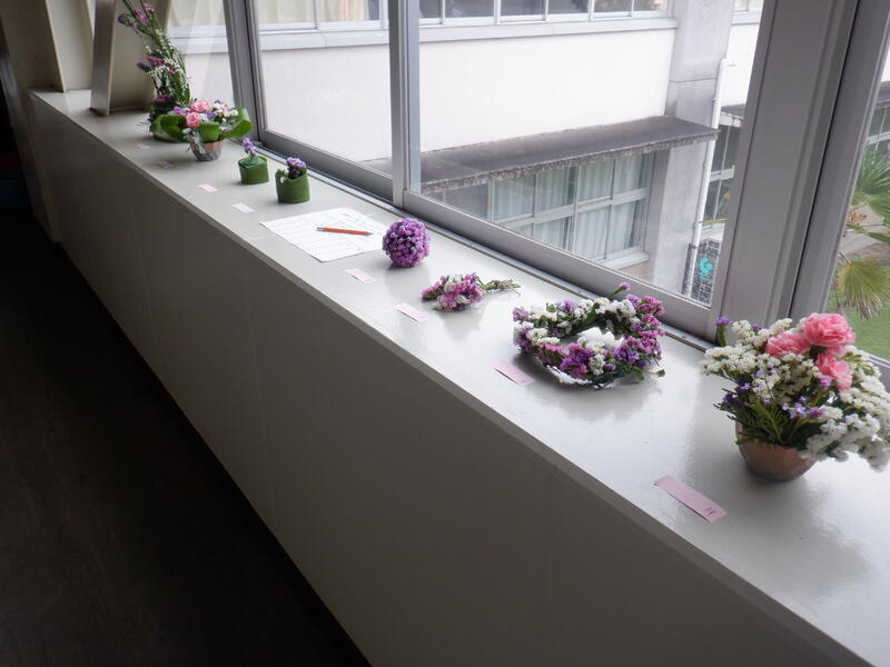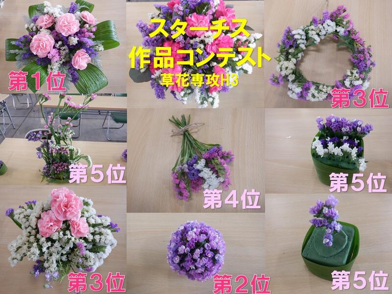 園芸科で栽培したスターチスで作った園芸科3年生草花専攻生のスターチスアレンジ作品ですが、3日間廊下に展示しました。コンテストで投票形式で評価してもらいました。それぞれが、デザイン性、レイアウト、長さや向きなど考えながら作成できています。100名以上の多くの先生方や生徒の皆さんに評価・投票していただきました。廊下を通りながら、「これかわいい」「俺はこれがいいと思う」「私これほしい」「私これ好き」「いいね」などたくさんの評価をいただきました投票ありがとうございました