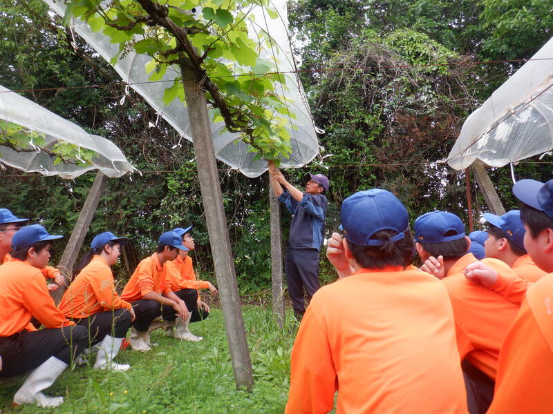 菊農果樹園の人気のブドウ。つぼみとなる房が数多くなっています。これを形のよい、適度な粒数にするための摘果をしています。上部や先を切る、1本の枝に1房にする、稔枝をしながらトンネルからはみ出さないように誘引していくことも重要です。生徒達は難しい判断ですが、よく頑張っています。手際よく早い生徒もいるようです。今後が楽しみです。