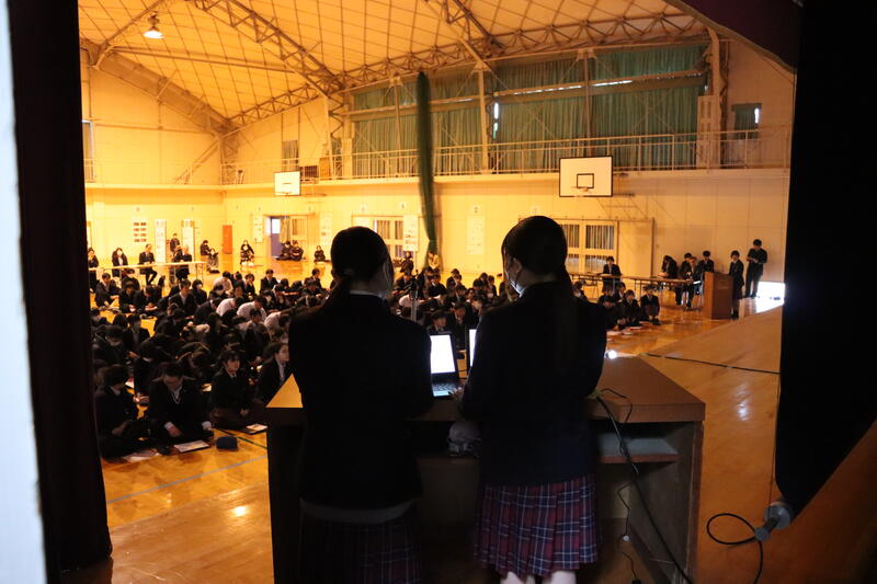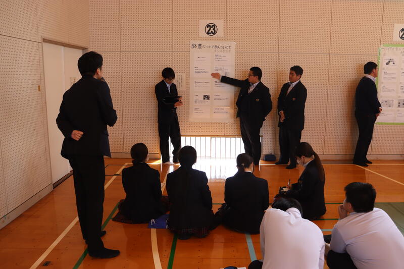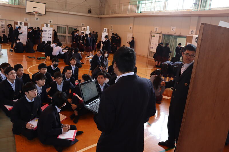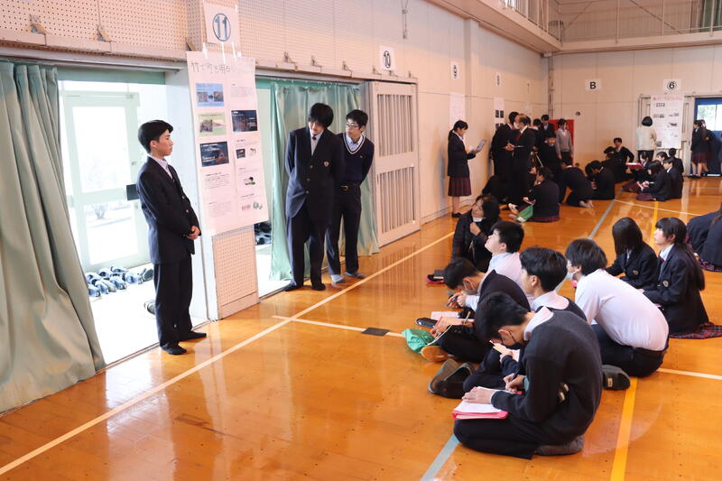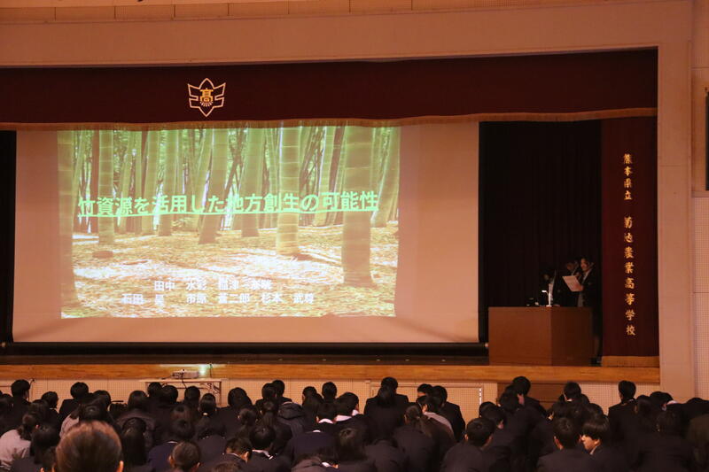 1年生は地域理解学習、2年生は地方創生をテーマに探究活動に取り組んできました。本日は、2年生がこれまでに学習してきた内容について、1年生に向けたプレゼンテーションを実施しました。前半は各ゼミの代表グループによるスライドを用いた発表、後半はその他の2年生によるポスターセッションを行いました。発表する側も聞く側も熱心に取り組み、会場はとても活気に満ちた発表会となりました。審査をしていただいた菊池市役所、熊本大学、その他の方々に感謝申し上げます。