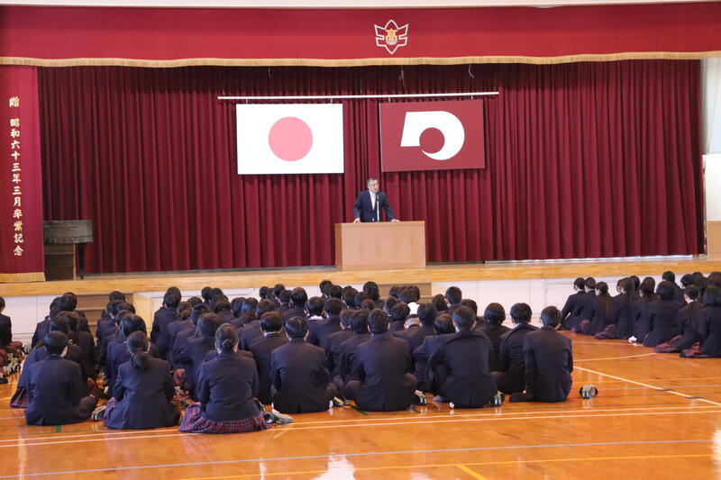 続いて行われた始業式では、校長先生より『世界情勢に関心を持つことの大切さ』についてのお話がありました。