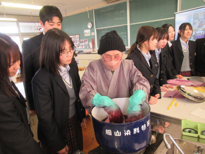 実施したのは1年生活文化科の生徒で、今回は正式な日本ムラサキの種から栽培して収穫した紫根を材料にして染色を行いました。