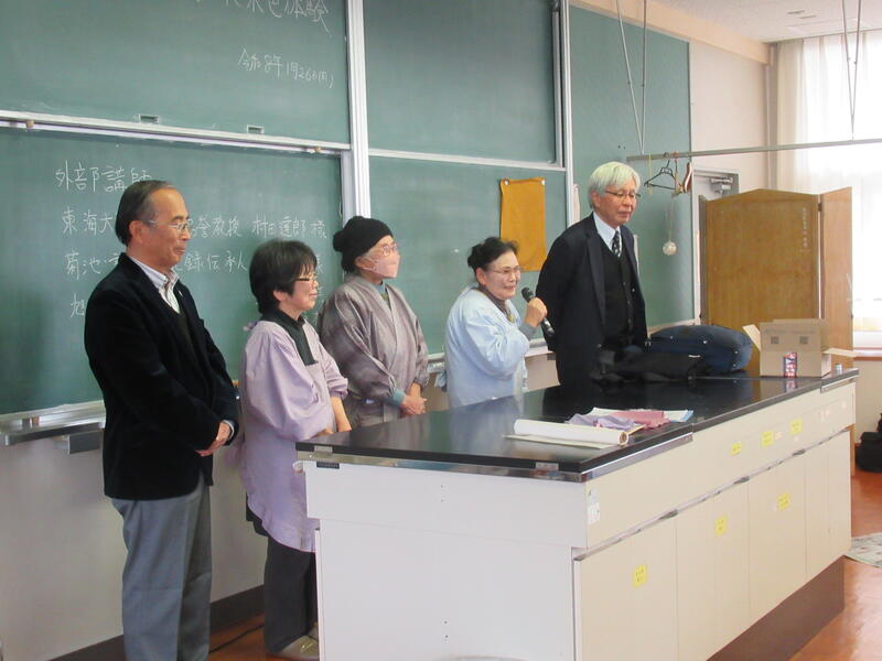 また、外部講師として東海大学農学部 名誉教授 村田 達郎 様、 菊池・記憶の記録伝承人 坂本 博 様、旭志むらさきの会 三池 哲子 様、水上 妙子 様、森 満子 様にもご指導いただき、菊池市と日本ムラサキの関わりや染色技術について、分かりやすく説明をしていただきました。
