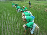 農業科1年生がヒエ(田の草)取り実習を行いました。生徒たちは全員裸足になり田んぼに入り1列に並んでヒエを取りました。始めは稲とヒエを区別するのに苦労していましたが、慣れてくると素早くヒエだけを取り除くことができるようになりました。