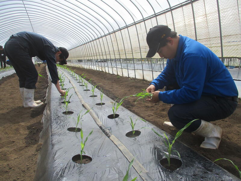 2年生の総合実習の時間に、スイートコーンの間引きと追肥を行いました。