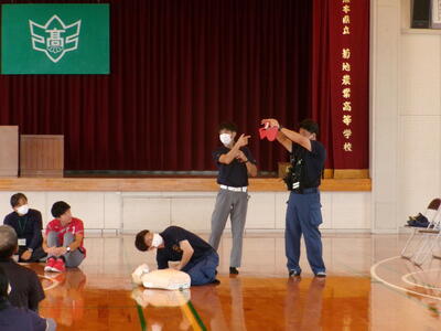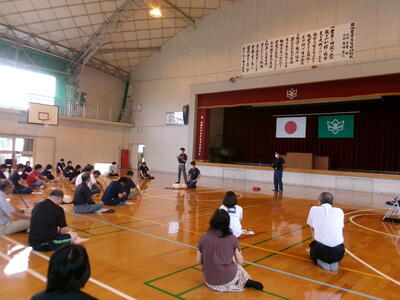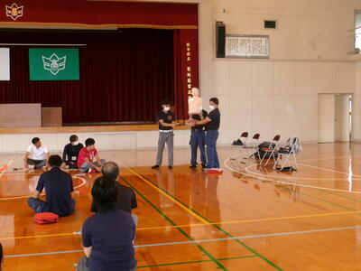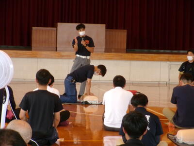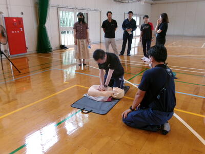菊池広域連合消防本部西消防署より消防隊員3名来校いただきまして、『救急救命法講習会(職員研修)』を実施しました。内容としては、心肺蘇生法とAEDの使用方法について学びました。また、熱中症・アナフラキシーの対方方法についても教えていただきました。夏休みにも入り、暑い日がこれから続きます。この研修会が役立つ前に、熱中症対策などしっかり行って、事故防止を心がけていきましょう。