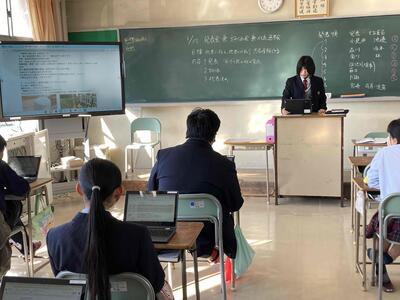 総探の時間では『菊池の魅力探究』を目的に、授業を行ってきました。菊池市長の講演会を導入として、菊池の魅力的な資源や情報、スポットを知り、各自が探究テーマを設定し、「もっと魅力的にするアイデア」や「課題解決につながるアイデア」を考えました。今回はクラス内で報告会を行い、情報共有する機会でした。あわせて、互いの報告について評価を行い、1/25に行われる「合同発表会」に参加する代表2班を選出しました。独特なアイデアや捉え方があり、菊池の魅力創造について探究することができました。少しずつ探究的な学びの意義や価値についても理解できてきたようです。