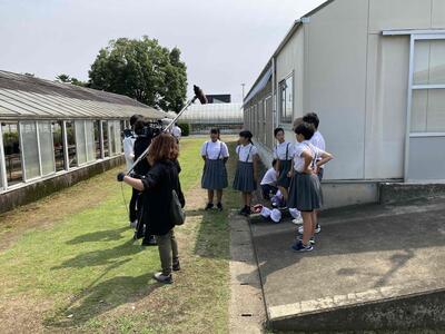 園芸科野菜部門のスイカ栽培ハウスを花房小学校生7人が訪れ、熱中症と温度・湿度・風の関係について体感する取材に協力しました。