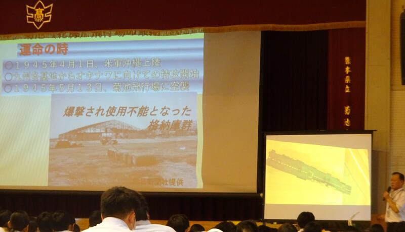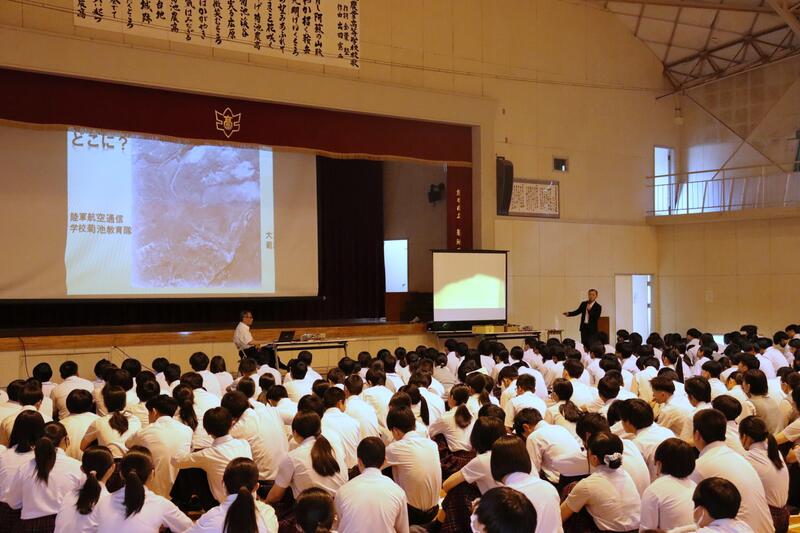 1時間目に全校生徒、職員参加の人権教育講演会がありました。演題は「菊池(花房)飛行場について考える」です。戦時中に旧陸軍菊池飛行場が本校やその周辺にあったことやそこで被爆した方のことなど、詳しく知ることができまし