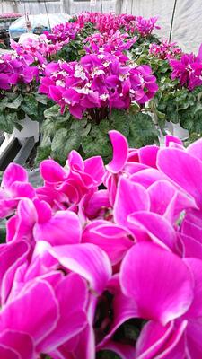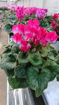 生徒たちが丁寧にリング広げ・葉組みをしていた成果が出て、遅咲きだった5・6号鉢が1月には開花してとてもきれいなんです。時期が遅いため、この時期のご購入は少しお値段をお買い求めやすくしております。多色やフリル、額が白いなどいろんな品種も残っていますのでおすすめです。長ければ4月ごろまで咲くものもあります。2月下旬からはサイネリアが咲きそうな状態でつぼみが増えてきました。お楽しみに!