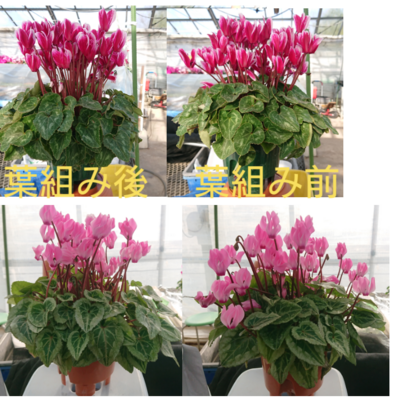 園芸科では販売のピークが過ぎても生徒たちはシクラメンの管理を行っています。購入後のシクラメンはいかがでしょうか。花数も増えて少し広がってきたときは、葉組みをおすすめします。咲き終わった花や枯れ葉は抜き、花を中心に、葉を外側に1枚1枚動かしていくと、バランスがよく整います。