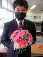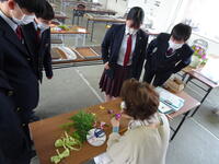園芸科では国家資格フラワー装飾の技能検定3級が取得できます。今回は2年生1回目の練習です。花束とフラワーアレンジメントです。スパイラル状に花束を作って、それをさらにフラワーアレンジメントとして作るという練習です。今は花が高い時期なようで貴重な講習会です。隈本先生のご指導のもと、丁寧に作ることができました。初めてで時間はかかりますが、花束は手が外れないようにぎゅっと持ちながら回転して花を束ね、アレンジメントはきれいなドーム状になるように長さを調整しています。生徒たちは「難しいです、手が痛くなります、同じ向きにならないです」などの声がありましたが、「初めてなのにとても上手」とほめていただき、作品が完成したあとは笑顔で「できました、うまくないですか~、きれいにできた~」と達成感・満足感です。