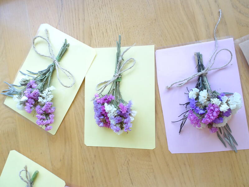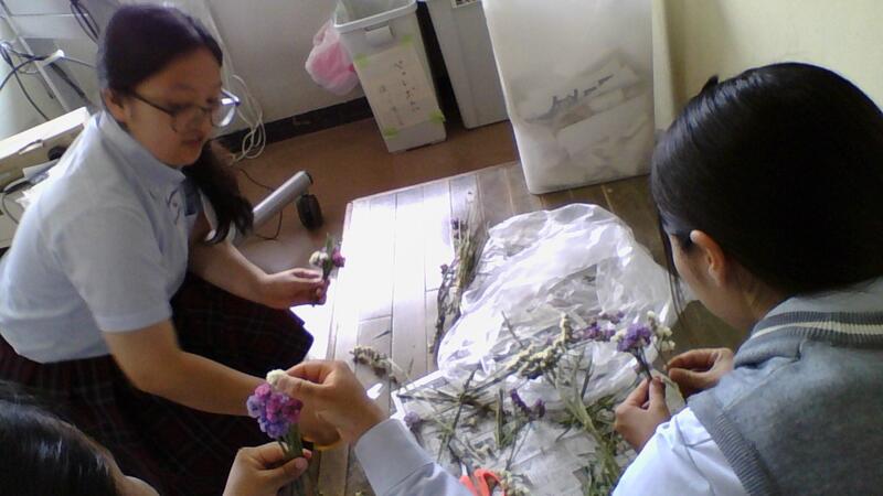 オープンスクールでの草花の授業ではスターチス・シヌアータという園芸科で栽培している草花をドライフラワーにしたものを使ってミニスワッグ壁飾り作りをしました。スターチスだけでなく、ローズマリーやラベンダーなどの葉物ハーブも入れて香りも楽しめるように作成しました。量や色、長さ、花の向き、バランス、リボンの結び方などそれぞれの生徒が工夫して作成しました。思考・判断・表現ができた作品に仕上がっていますとてもかわいい作品に仕上がっています。オープンスクールで見学してくださった中学生6名にもご参加いただき、小さなドライフラワースワッグを作って持ち帰ってもらいました
