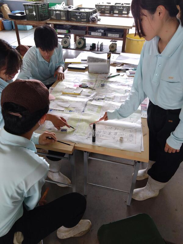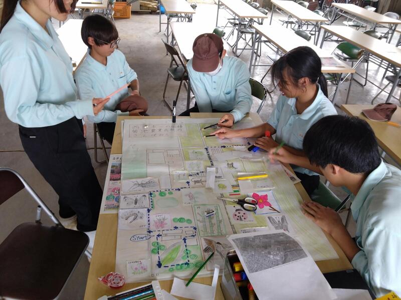 西日本一を誇る面積の菊池農業高校の敷地にはどんな自然があり、生き物たちがいるのかを調査研究しています。草花だけでなく、樹木、昆虫、野鳥など数多くの生き物がいることがわかりました。園芸科3年生の中でも絵の上手な生徒が多く、生物のイラストも生き生きと描けています。クロムブックで名前を調べたり、生態を調査したり、場所ごとのポイントに分けて研究していきました。調査した内容は模造紙にまとめました。植物はありすぎて書ききれませんでしたが、印象に残る生き物たちだけを記入していってもかなり多く、その生き物たちの生態系や食物連鎖、育てている農作物に対して害虫・益虫などいろんな形で学校の生き物たちがつながっていることが分かりました。