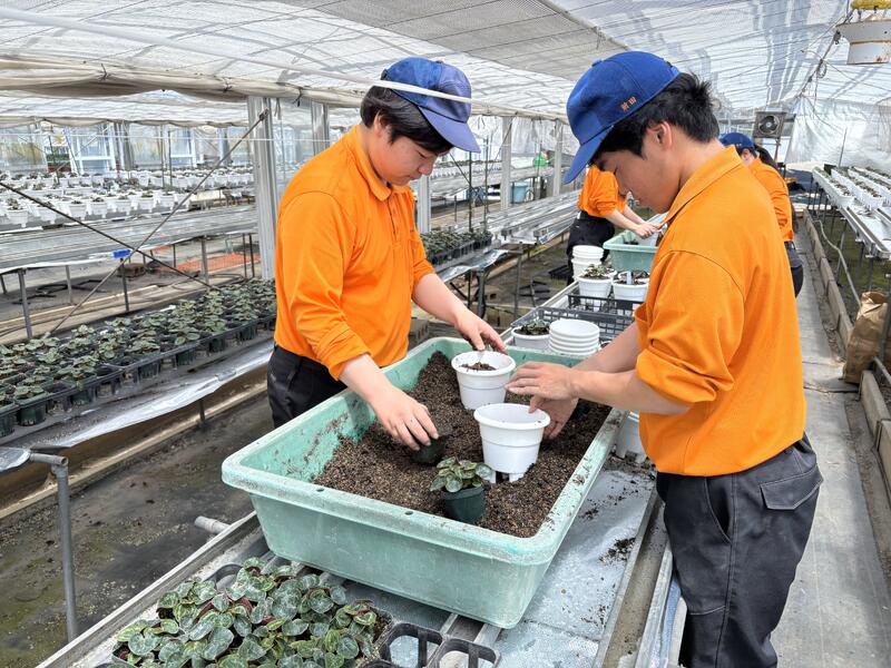 3年生の草花専攻生でシクラメンの鉢替えを行いました。