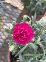 3年草花専攻生で寄せ植えを作りました。プランターや宿根草を選び、私たちが育てている花苗やカーネーションを使って、色やバランス、高さ、はみ出すグリーンや垂れ下がるグリーンなどを考えながら作りました3ツ星