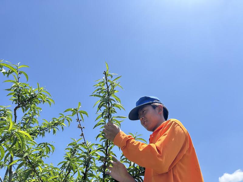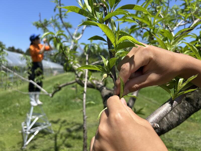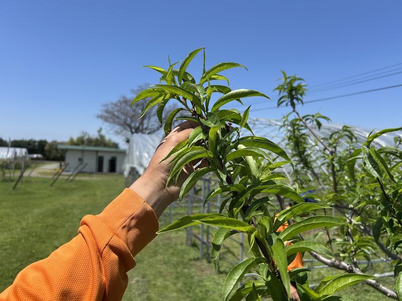 モモの小さな実が実っているで、その実の場所と数を調整して摘み取っています。モモの葉も茂ってきて、青々としています。小さな実を見つけ、枝ごとにならせる数や間隔を考えながら、生徒達は実習しています。おいしいモモができるまで、頑張ります!