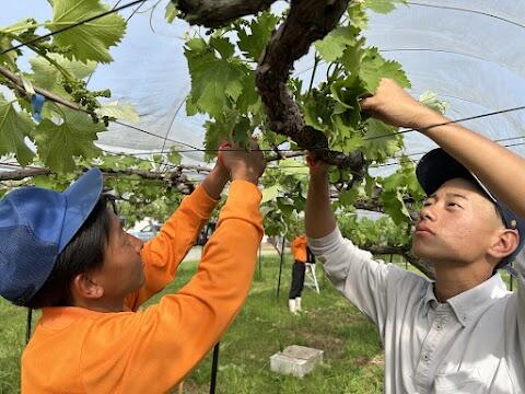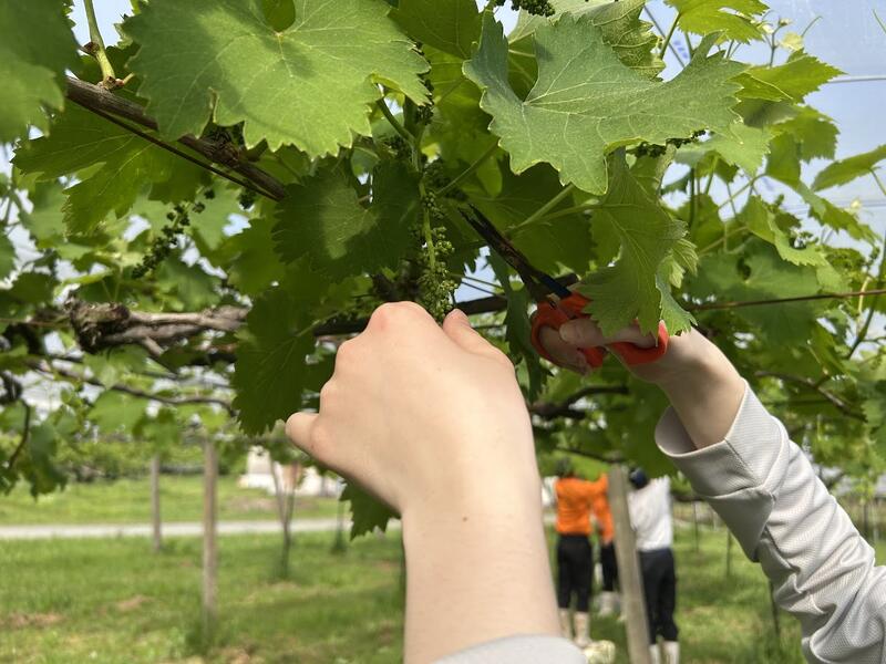 ぶどうの摘果が忙しくなってきました。実る房のまま育ててもおいしいぶどうはできません。必要な部分だけを残します。この整房の作業で、今後のブドウの粒の大きさや密度が変わってくるので大事な作業です。生徒はGWも3時間当番に出てきて頑張りました。