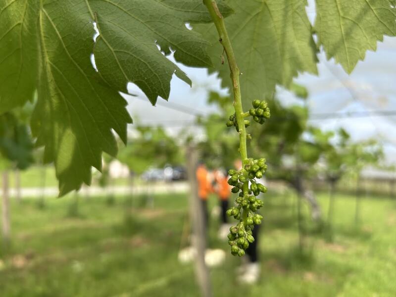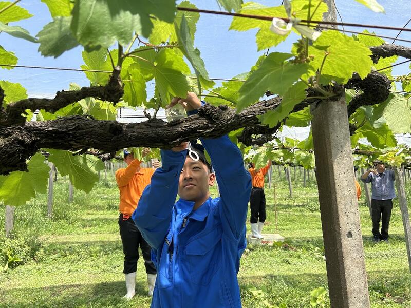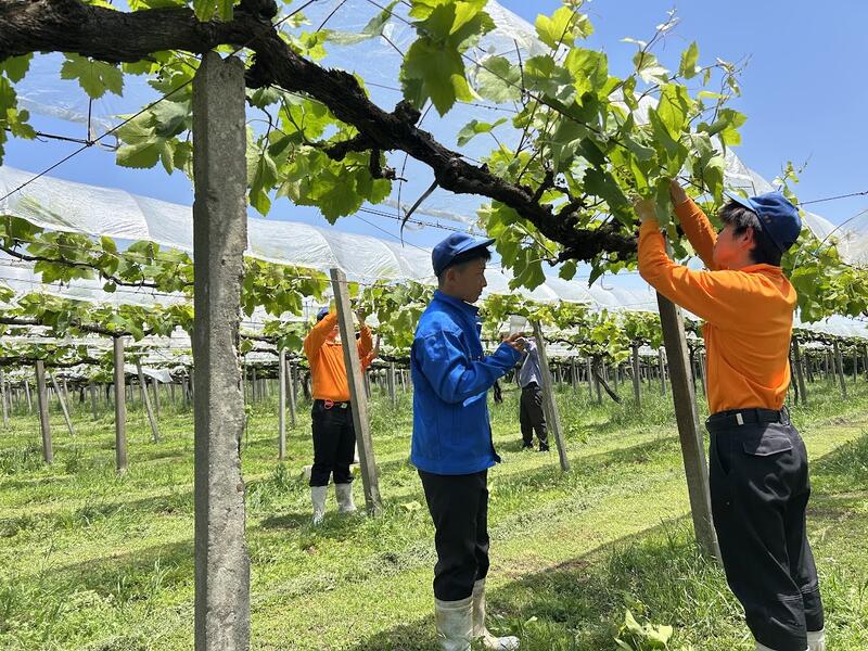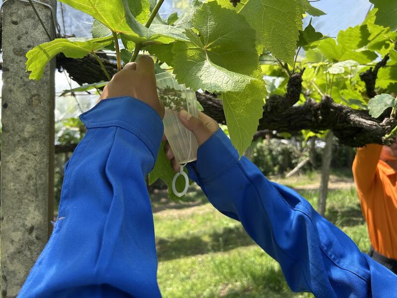 小さな実をつけているマスカットベリーA1ツ星無核のために1回目のホルモン(ジベレリン)処理を行いました。植物成長調整物質のジベレリンを一房ずつ漬けていくことで、ブドウの種ありを種子なしにできると考えるとすごいですよね。お客様が食べやすいように種なしにする技術を使ってコツコツと頑張っています。多くのお客様が楽しみにされているので、やる気も出ることでしょうキラキラ