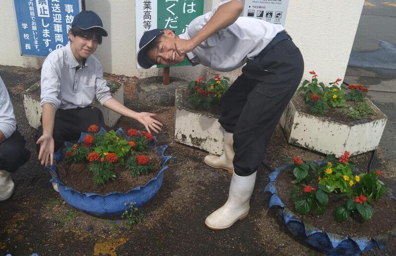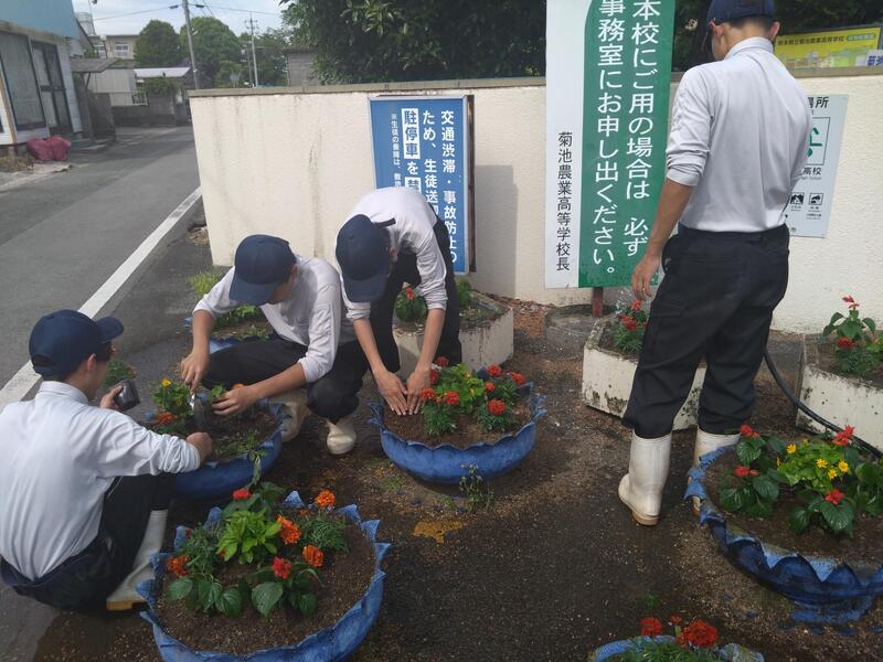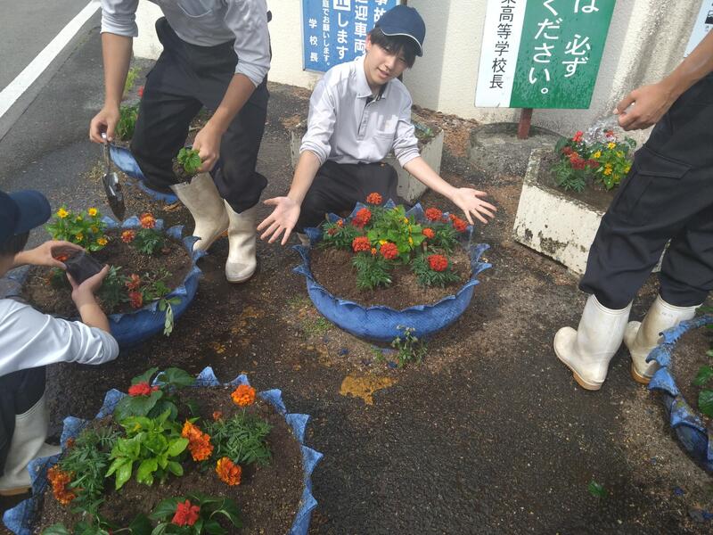 正門前の花壇に花苗を植えました。暖色系で夏らしくサルビア、マリーゴールド、メランポジウム、ポーチュラカを丸い花壇に6つずつ選んでバランス、色、統一性など考えながら植えていきます。生徒達は「このサルビア葉がきれい、画像で見たのと違う」と座学で学んだ画像と比較して実物をよく花を観察しています。「どうしてこの花はしおれたのかな」『水を欲しがっているんじゃないかな』「この幼虫は何ですか」『ツマグロヒョウモンのチョウの幼虫だね、ビオラを食べていた害虫だから取り除きましょう』などと植えかえながらも発見したり、疑問を持ったりしながら探究的に学習しています。とても意欲的です3ツ星まだポーチュラカは小さく、花が咲いていないので「この花の最終形態を知らないからどう植えるといいか難しいな」と話す生徒もいて、「最終形態」という言葉がゲームの中の世界観のようで面白い表現ですね了解