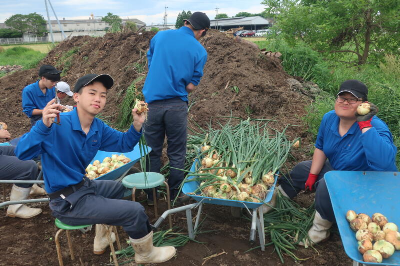 農業科ではトマト、玉ねぎの収穫が始まりました。今年も立派な野菜ができています。今日は今シーズン初めての収穫となり、生徒も自分で育てた野菜なのでとても嬉しそうでした。毎週金曜日の9時半より本校トラクター演習場で販売しております。お待ちしております笑う