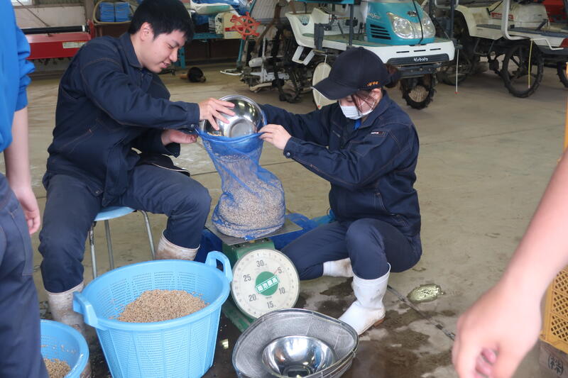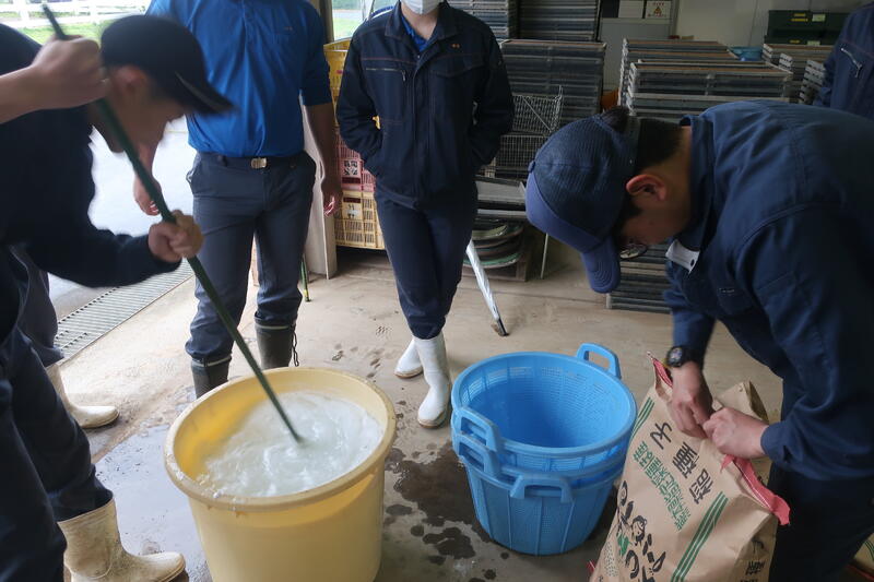5/9日金曜日に3年生の作物専攻生で塩水選の授業を行いました。塩水選とは稲を栽培するための種もみ塩水に浸けて、良質な種もみとそうでない種もみを選別することです。そして良質な種もみだけを稲の種として使用します。今回は生卵が浮く程度の塩水濃度で行いました。
