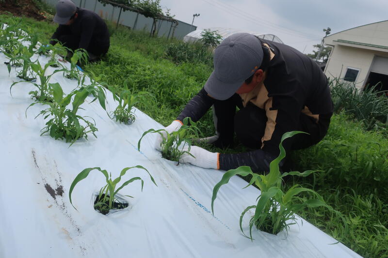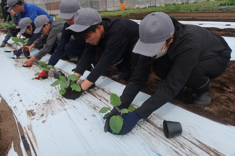 農業科1年生ではスイートコーンの間引きとナス、ピーマンの定植を行いました。初めての事で戸惑いもありましたがとても上手に植えることができました。