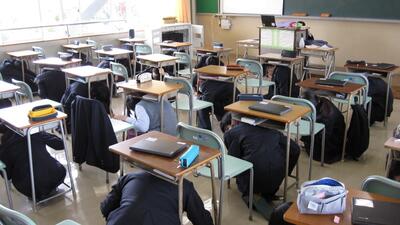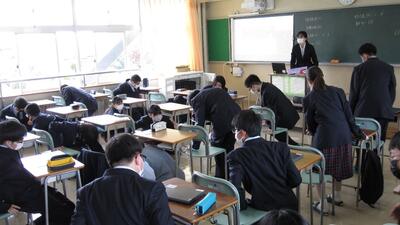 緊急地震速報の放送を聞いて教師の指示で安全行動に移る生徒達