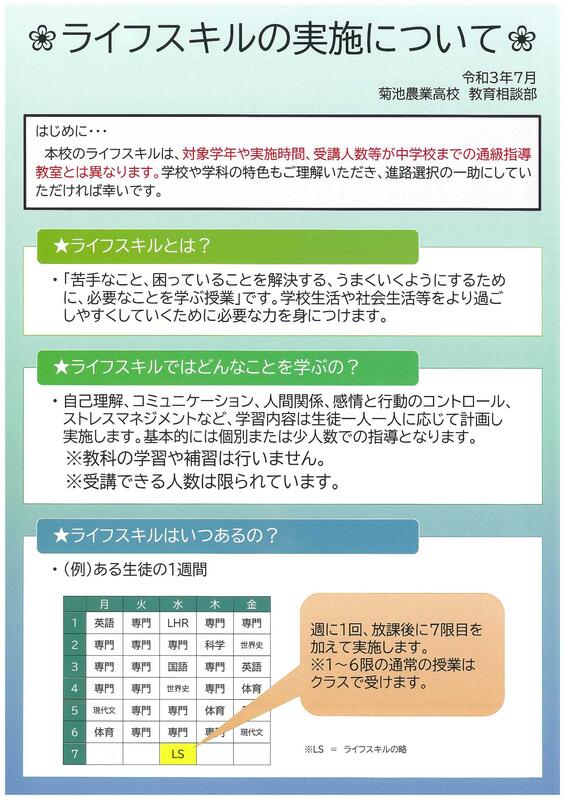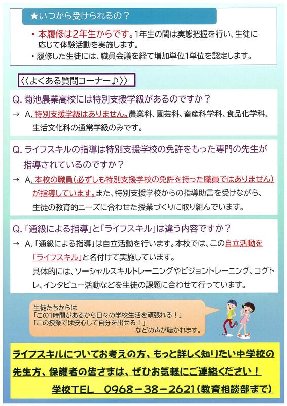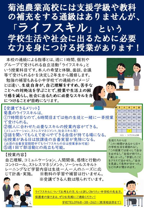 菊池農業高校には特別支援学級はありませんが、「通級による指導」=「ライフスキル」という7限目の自立活動のみの授業はあります。小中学校のような通常学級から個別の学級へと移動して受ける個別授業とは異なります。また、その7限目の授業で教科の補充や教科の個別指導はできませんのでご了承ください。希望者は2・3年生からスタートします。社会に出るために必要なコミュニケーション、人間関係、ストレスマネジメントなど学校や社会で困らないための「自立活動」を授業で取り組んでいます。詳しくはこちら↓の紹介をご覧ください