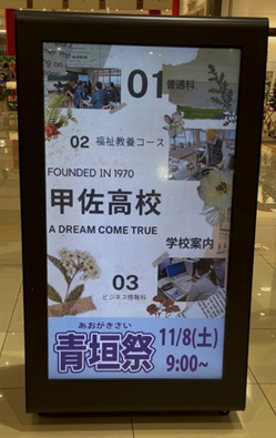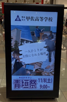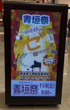 今回、イオンモール熊本 様のご協力により、館内デジタルサイネージにて本校文化祭の告知を掲載していただきました。地域の皆様に向けた情報発信の機会をいただき、心より感謝申し上げます。
