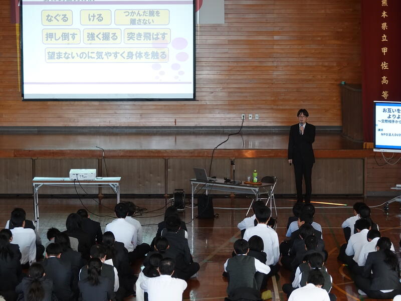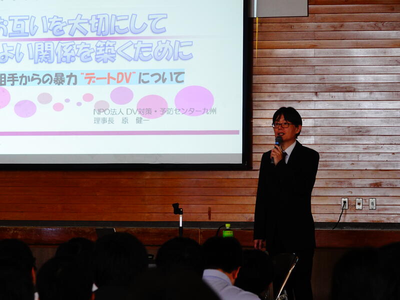 11月14日(金)にNPO法人DV対策・予防センター九州理事長 原 健一 様をお招きし、『お互いを大切にして、よりよい関係を築くために~交際相手からの暴力“デートDV”について~』と題して、講演会実施しました。感想文に『お互いを尊重することが大切だと学んだ。男女関係だけでなく、友達関係でも同じことが言えるので、日頃から言葉遣いに気を付けたい』『暴力ではなく、話し合いで解決したいと思った』等あり、学びの多い研修になりました。