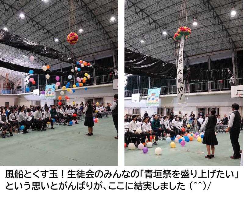 「・・・昨年度よりさらに進化した青垣祭にしたいと思います。(中略)それぞれ練習時間が少ない中、真剣に頑張ってきました。生徒会の出し物や展示などみんなで協力しながら作り上げました。今年もみなさんに笑顔と元気を届けられるように頑張りましたので、ぜひ楽しんでください」