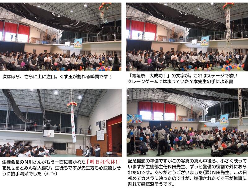 いや、すごい青垣祭でした。終わって2カ月たってこうやってまとめてみて、あらためてすごいなあと思いました、自分の学校ながら。先生方、特に生徒会担当の4人の先生方の「企画力、プロデュース力、実行力」がすごい。さらにそれについて行くというか期待に応えてくれる生徒たちが素晴らしいなあと思いました。毎年期待値を超えていきます。何度でも言います、ヤバいです。