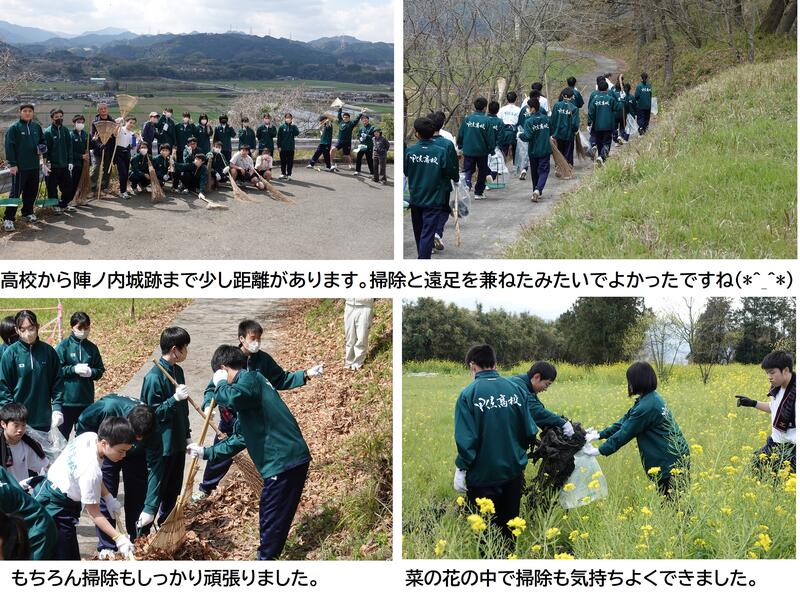 1年生が陣ノ内城跡、2年生が学校のグラウンドと加藤神社の清掃を行いました。1年生(次は2年生)が緑色のジャージ、2年生(次は3年生)が赤のジャージなので写真を見てもすぐにわかります。
